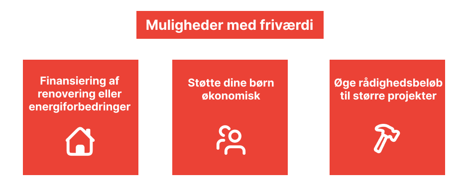 Et lån i friværdi fungerer som et supplement til dine nuværende lån. Når du udnytter din friværdi, øges din samlede gæld, men til gengæld får du flere penge til rådighed til andre formål.